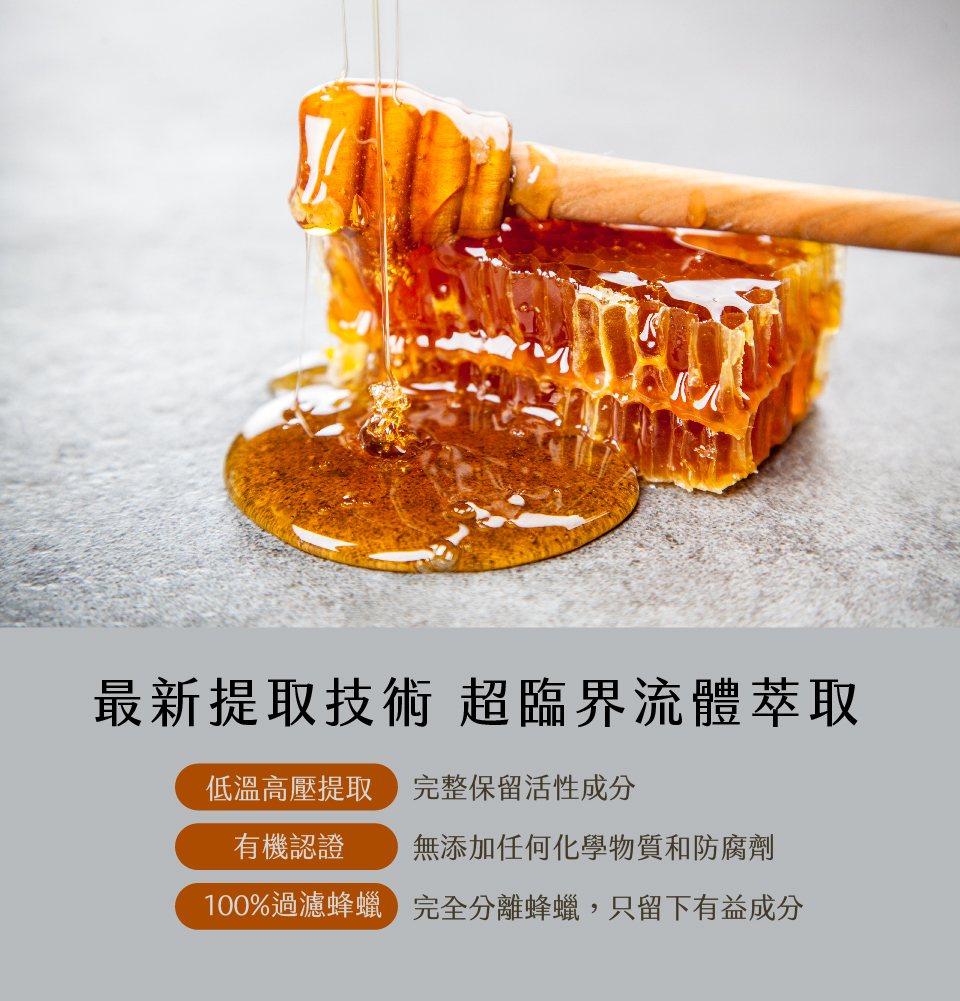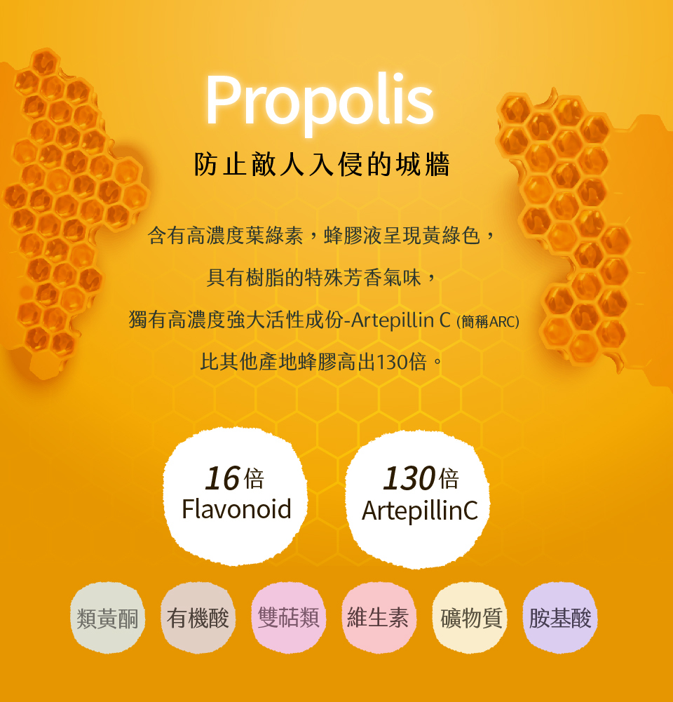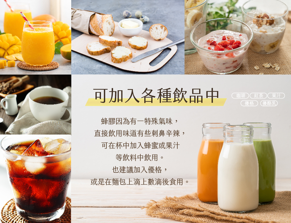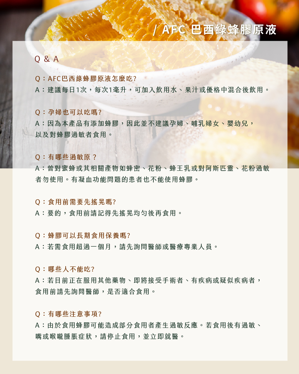 ※ 對蜂蜜或蜜蜂過敏的人請勿食用,懷孕期、哺乳期或對阿特比靈C(Artepillin C)或哮喘者請勿食用