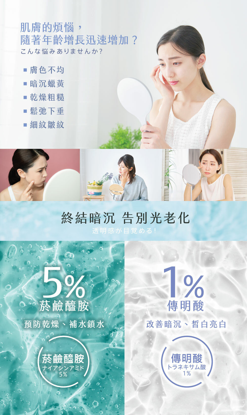 * 添加1%傳明酸,精準亮白,改善暗沉