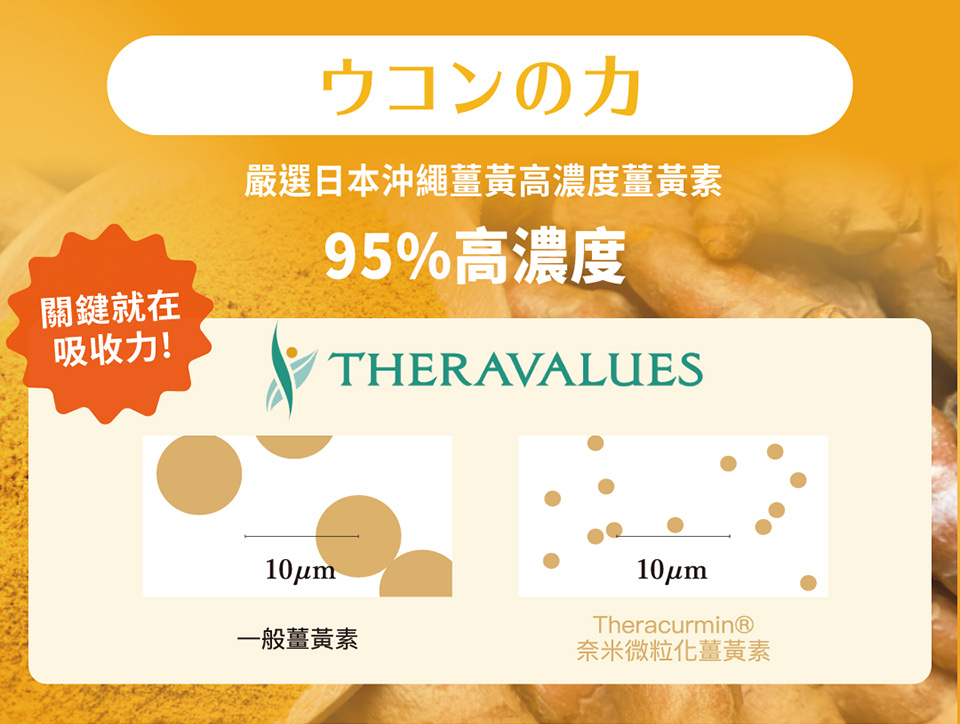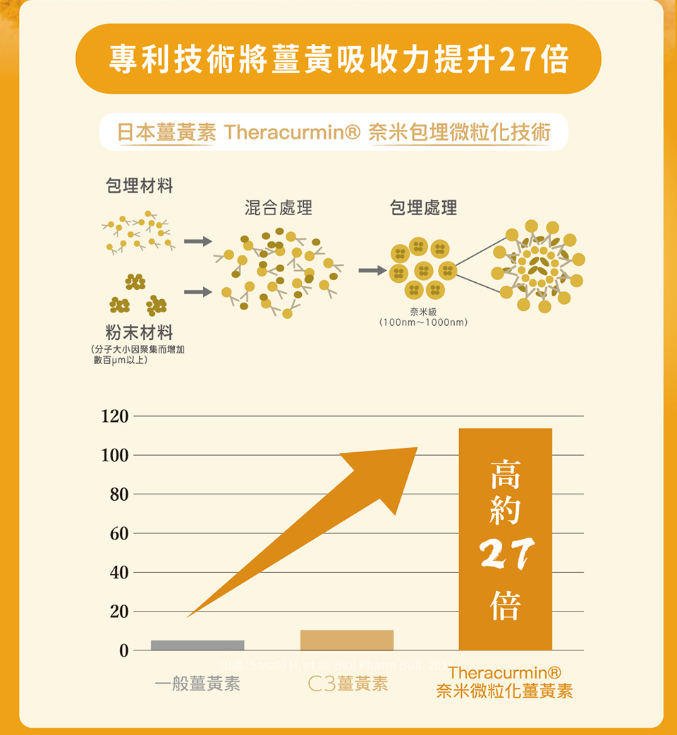 ▌ 專利Theracurmin®奈米化微粒薑黃素,吸收力提升27倍!